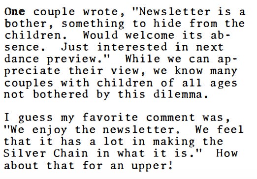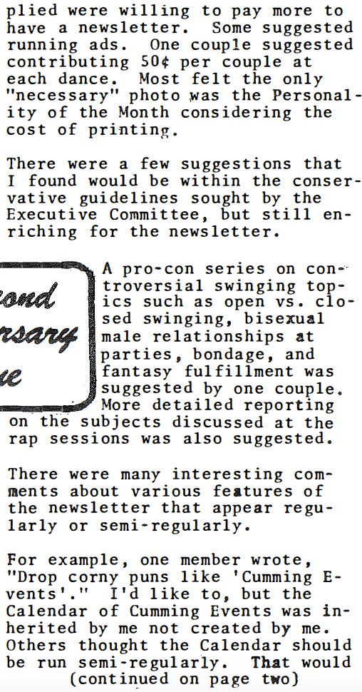 A dismal attempt at intellectual pursuit for a special interest group? It sounds like The Captain has heard some shady comments at The Thunderbird Motel. In this week’s bonus episode, we learn that Carol and George identified themselves as “Utopian Swingers” i.e. interested in the educational side of swinging, something that rings true with Carol’s writing in particular. But we also know from the conversations we’ve had with other Silver Chain members that this element of the club wasn’t for everyone.