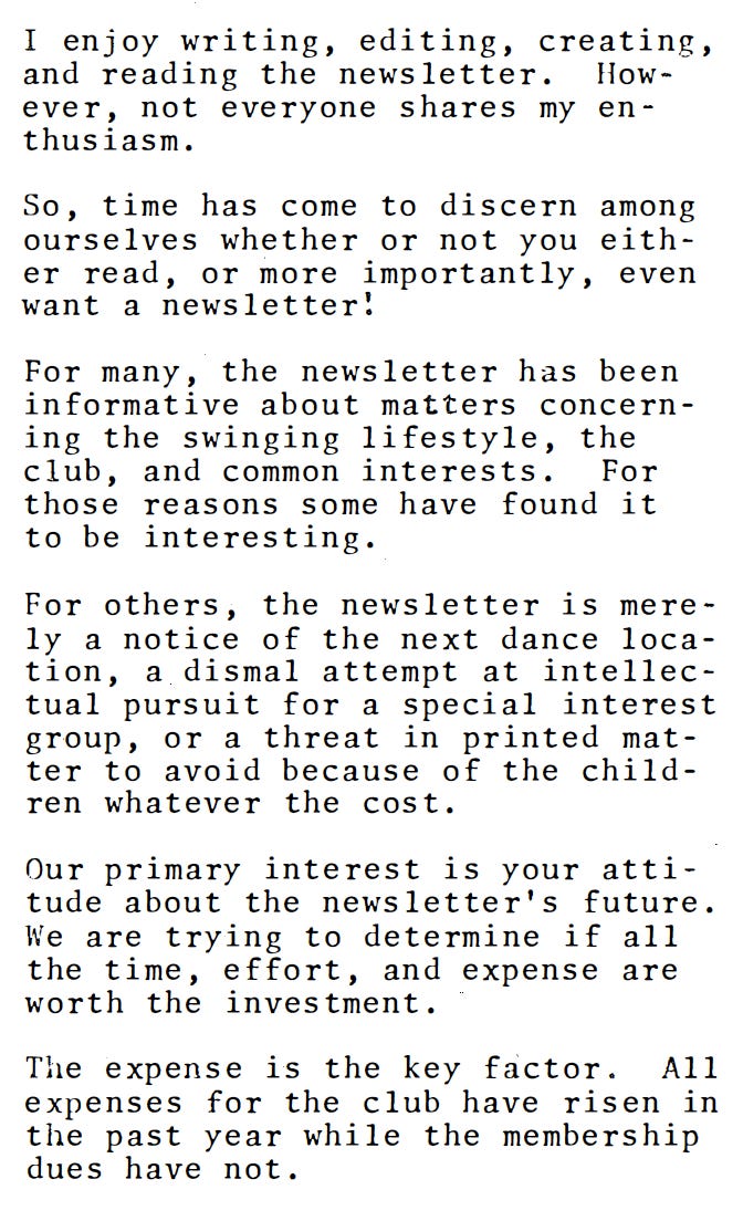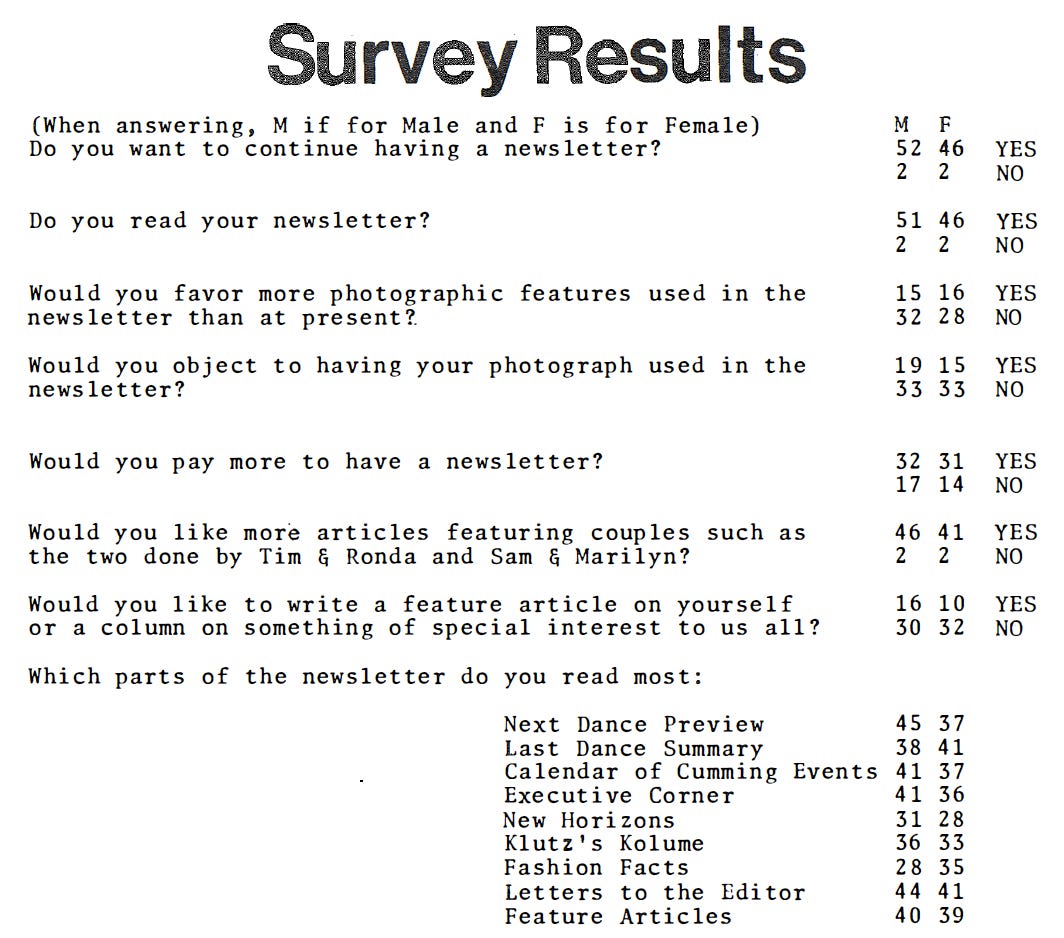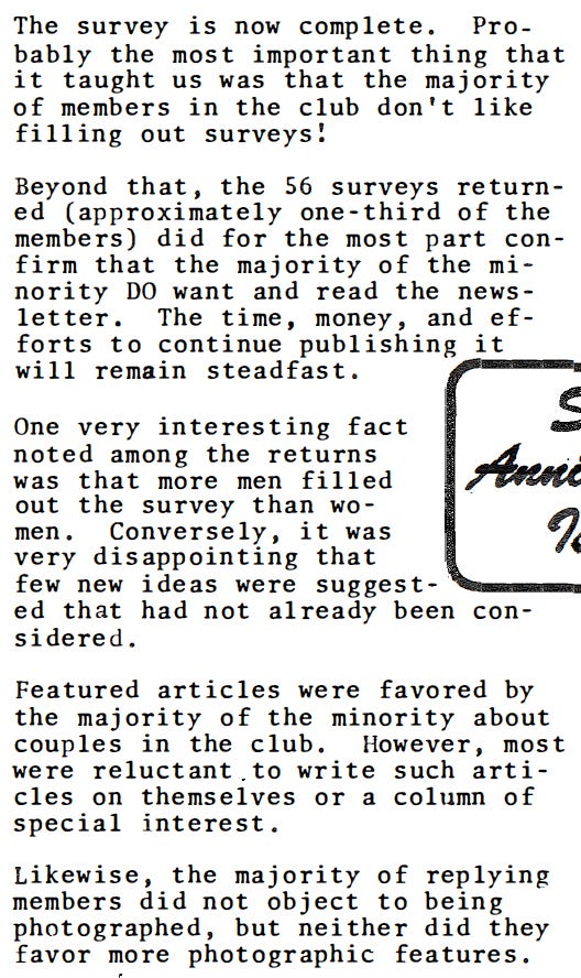 If The Kaptain’s estimation that only one-third of the club’s members answered the survey is accurate, this means that in April 1978, the club had over 300 members/150 couples.
