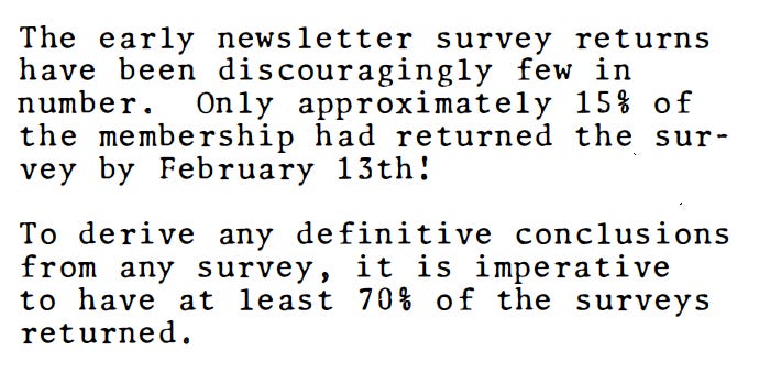 Almost fifty years later, both of these survey comments are correct. Very few things today can be well-hidden and indeed the newsletters, for us at least, play a major role in painting the image of what the club was. Here’s a summary of those results: